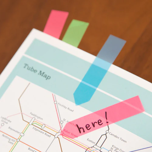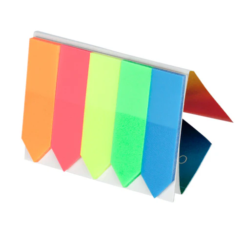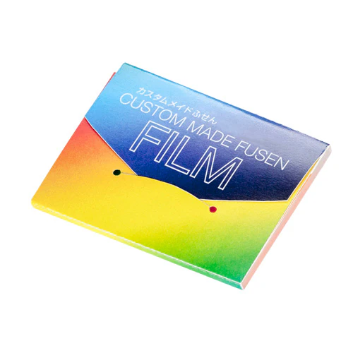 5種のフィルムふせん。100個から対応可能で、薄いので、手帳やノート、名刺入れなどに入れてもかさばりません。