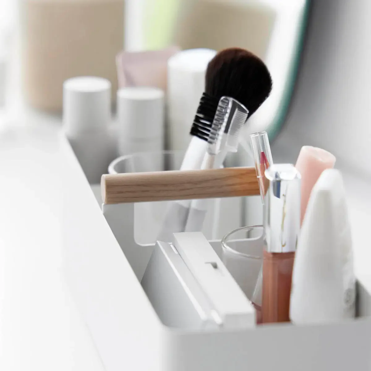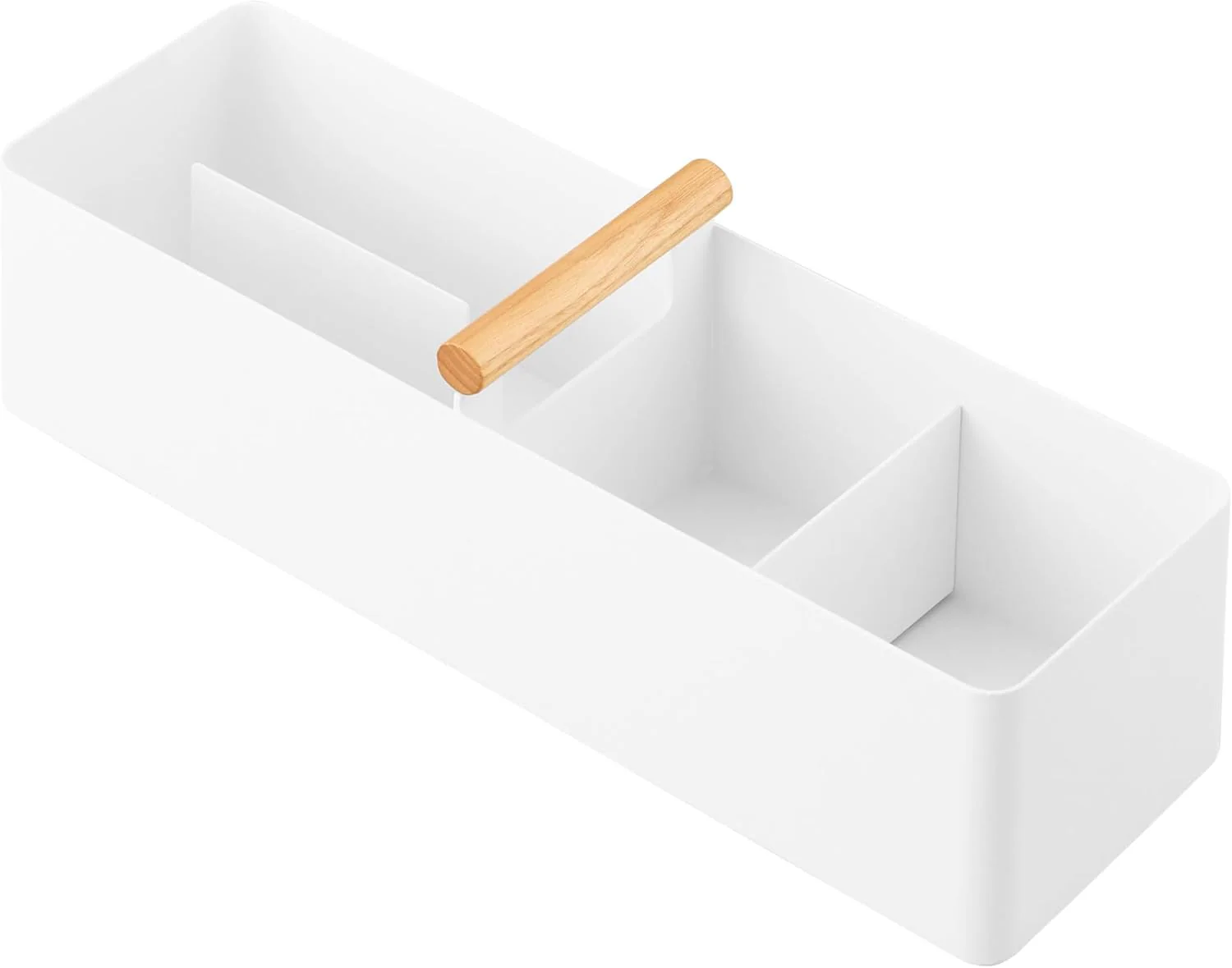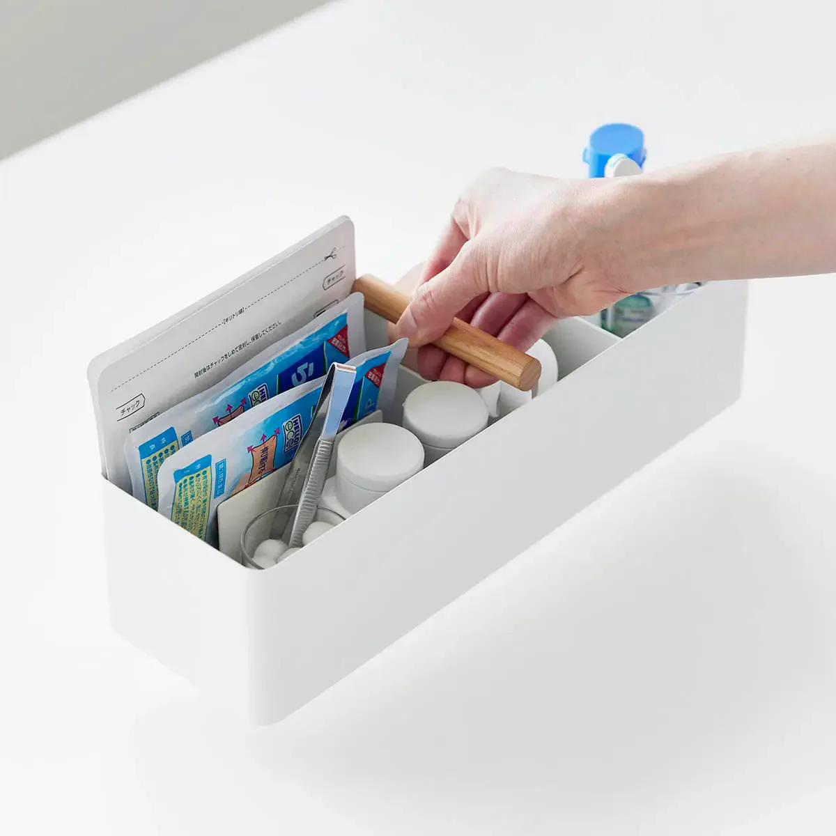 温かみのある天然木のハンドルとスチールの組み合わせがオシャレ。仕切りで細かく分類できるので、薬や衛生用品、メイク用品などの収納に便利。