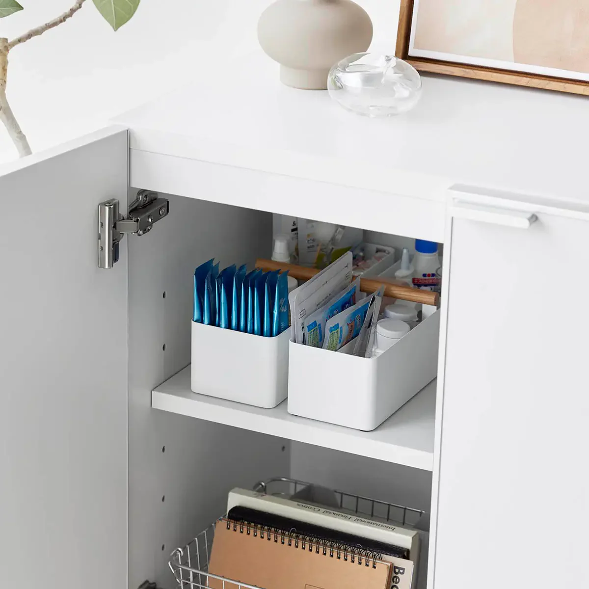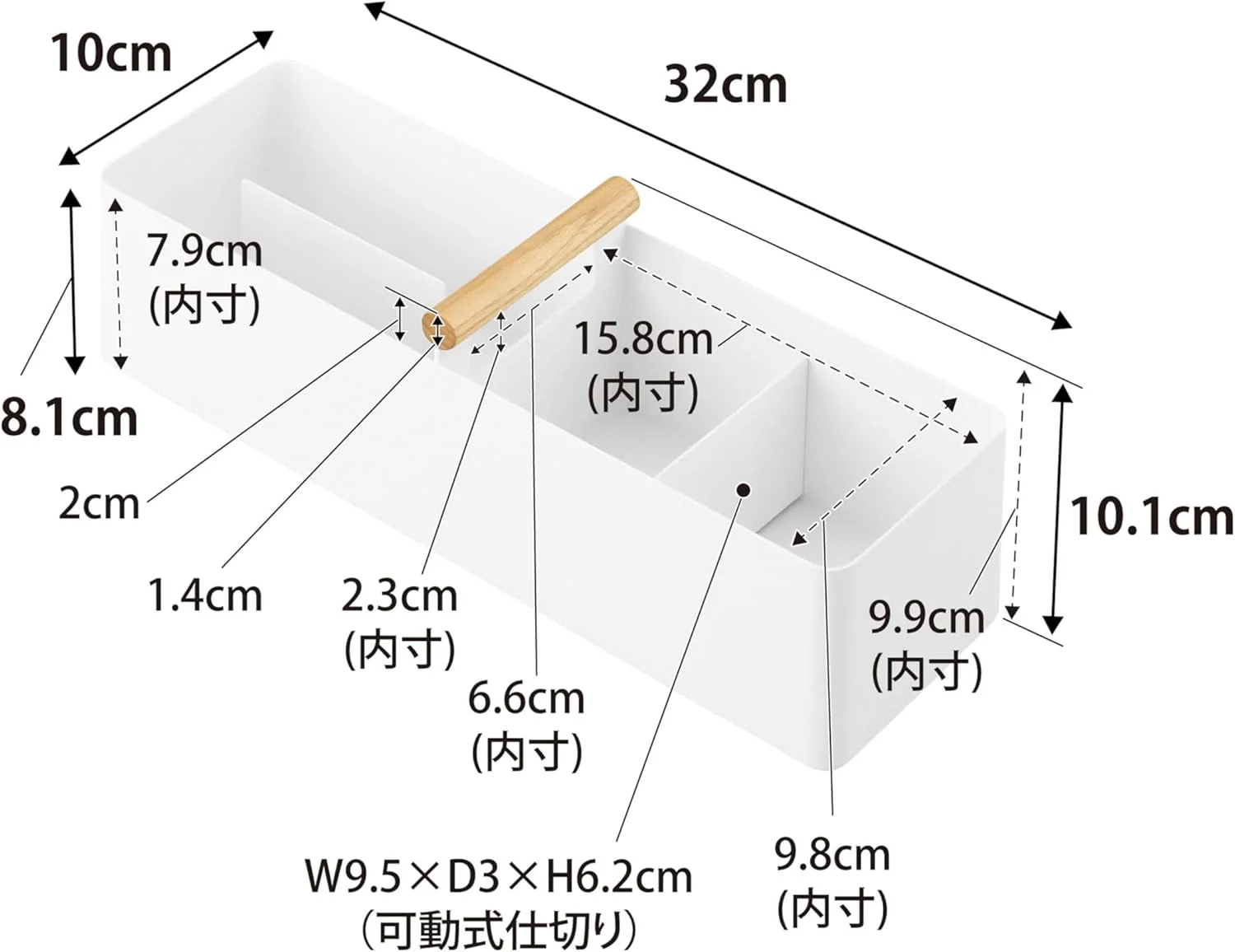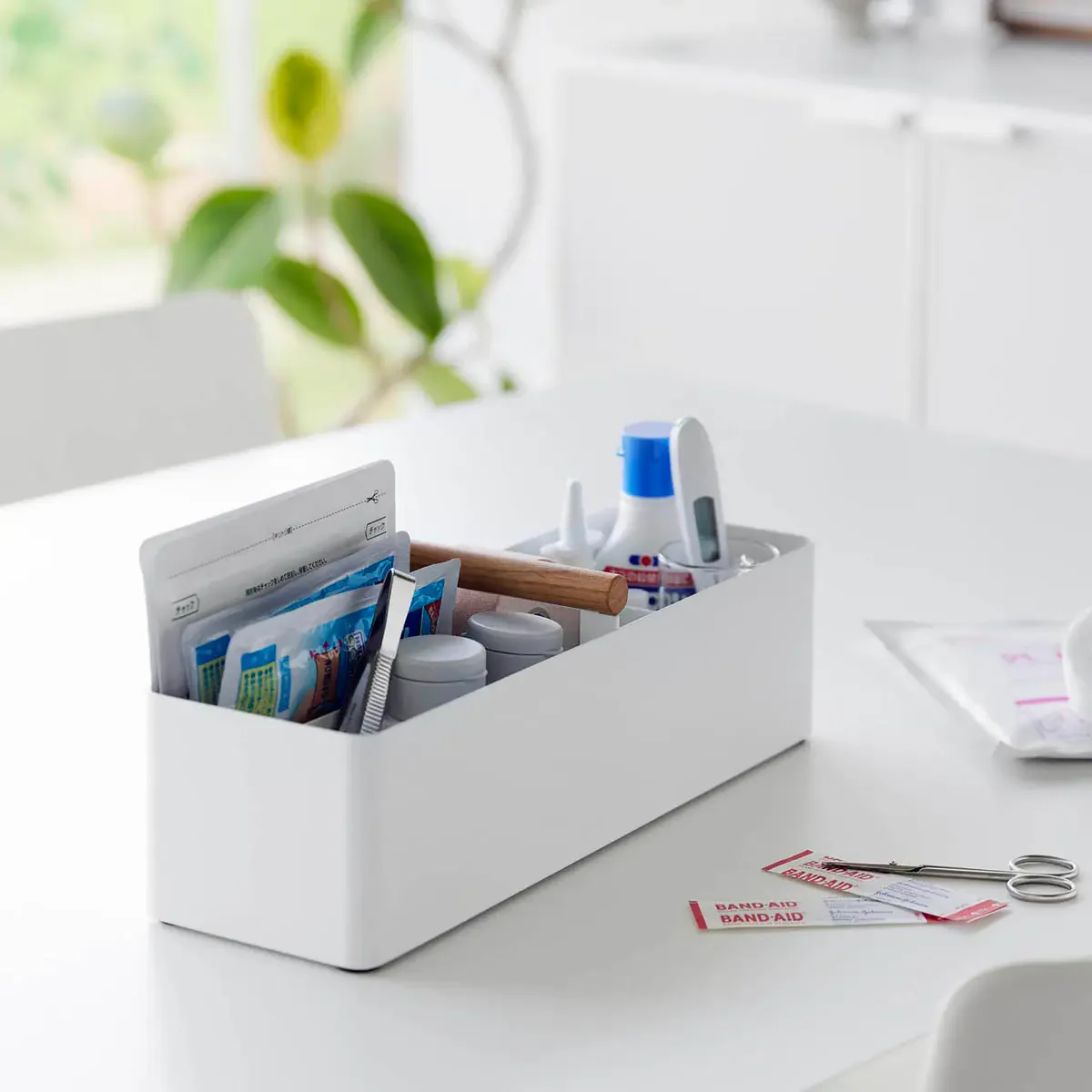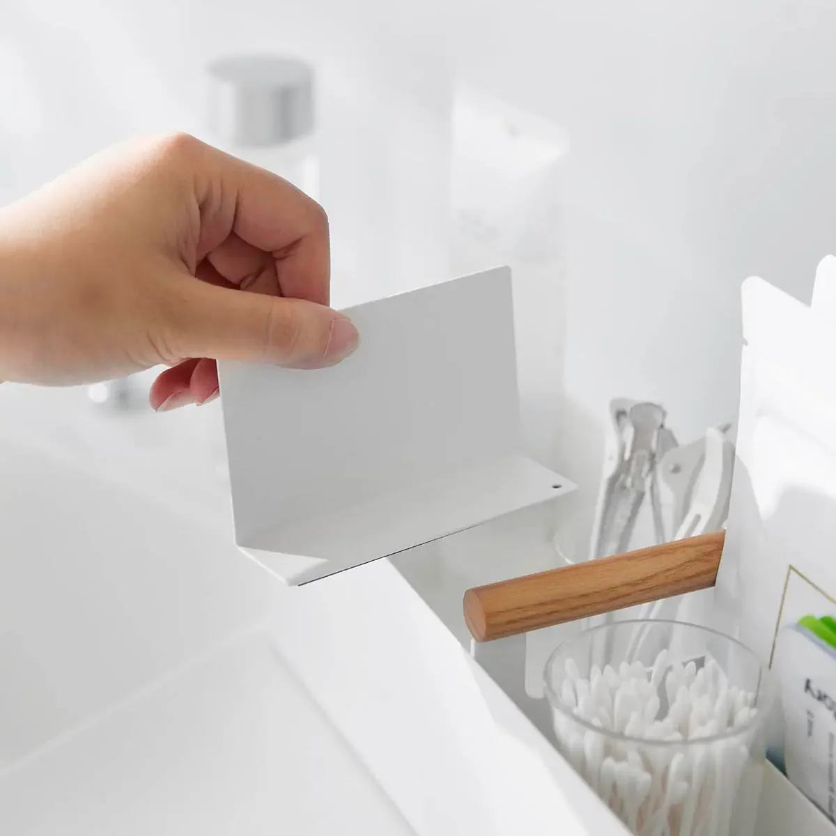 温かみのある天然木のハンドルとスチールの組み合わせがオシャレ。仕切りで細かく分類できるので、薬や衛生用品、メイク用品などの収納に便利。