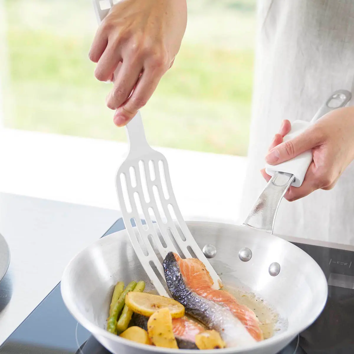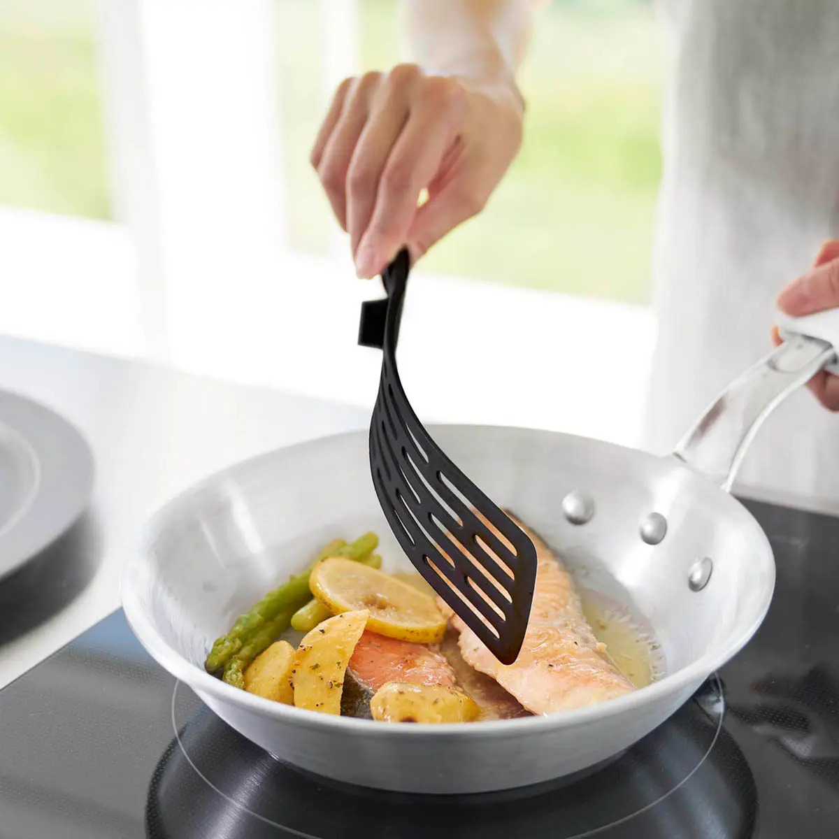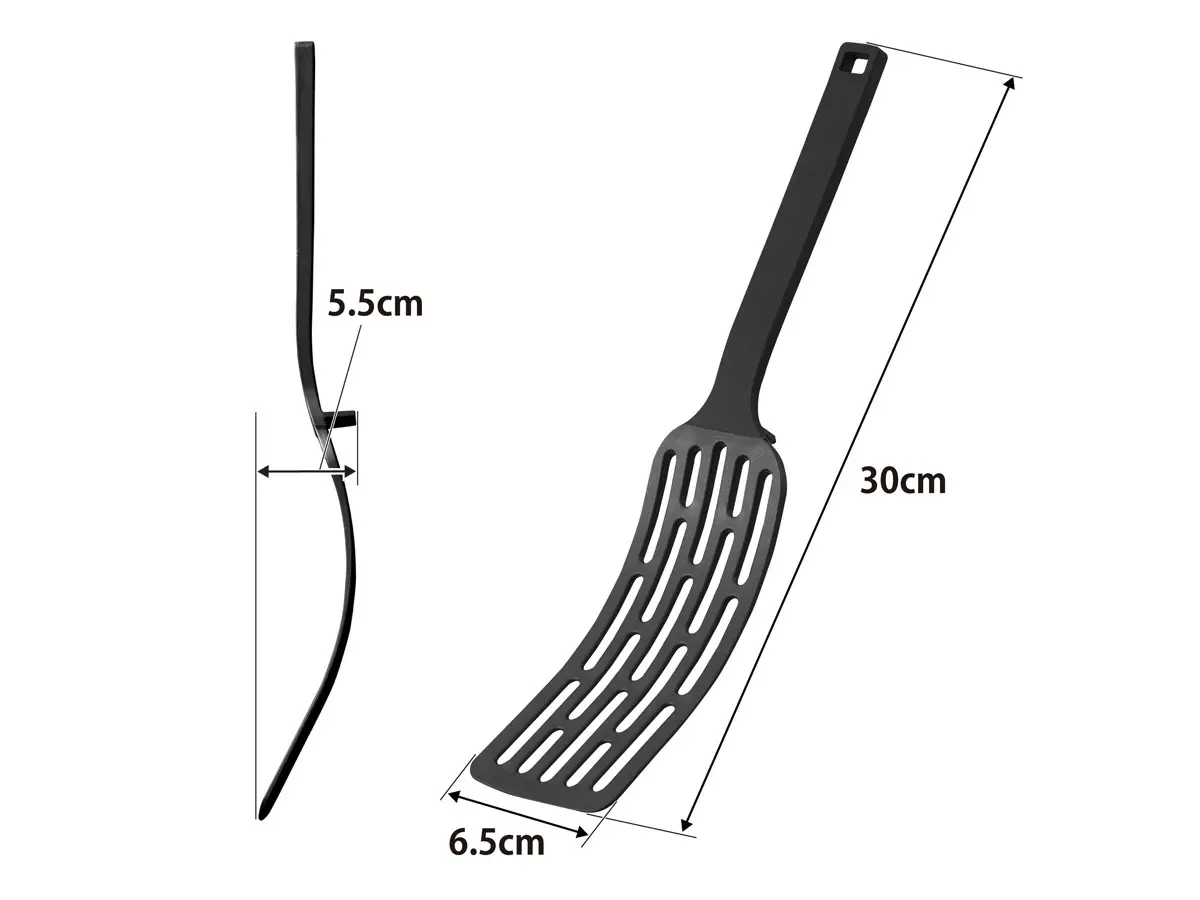 ヘラの部分に長い物を乗せやすいロングサイズのターナーです。しなやかに曲がりフライパンと食材の間に入りやすく、長い物も形を保ったままひっくり返せます。調理部分はナイロン素材でフライパン・鍋などをキズつけません。置いた時に先端が浮くデザインなので直置きにならずに清潔。食洗機に対応しています。
