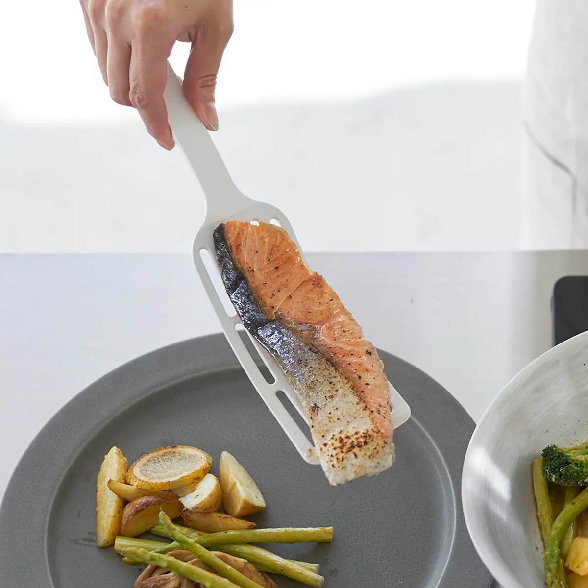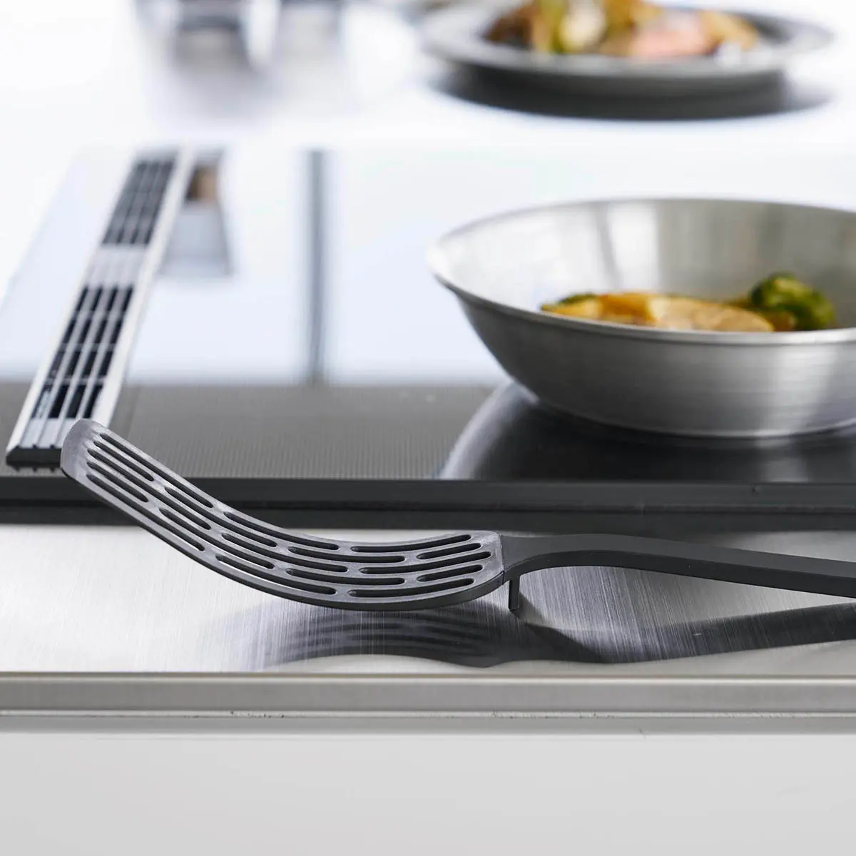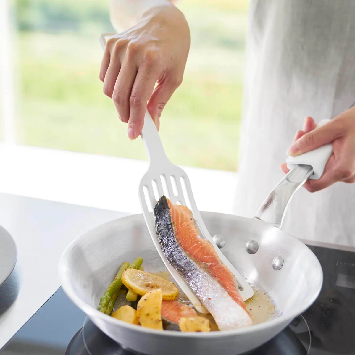 ヘラの部分に長い物を乗せやすいロングサイズのターナーです。しなやかに曲がりフライパンと食材の間に入りやすく、長い物も形を保ったままひっくり返せます。調理部分はナイロン素材でフライパン・鍋などをキズつけません。置いた時に先端が浮くデザインなので直置きにならずに清潔。食洗機に対応しています。