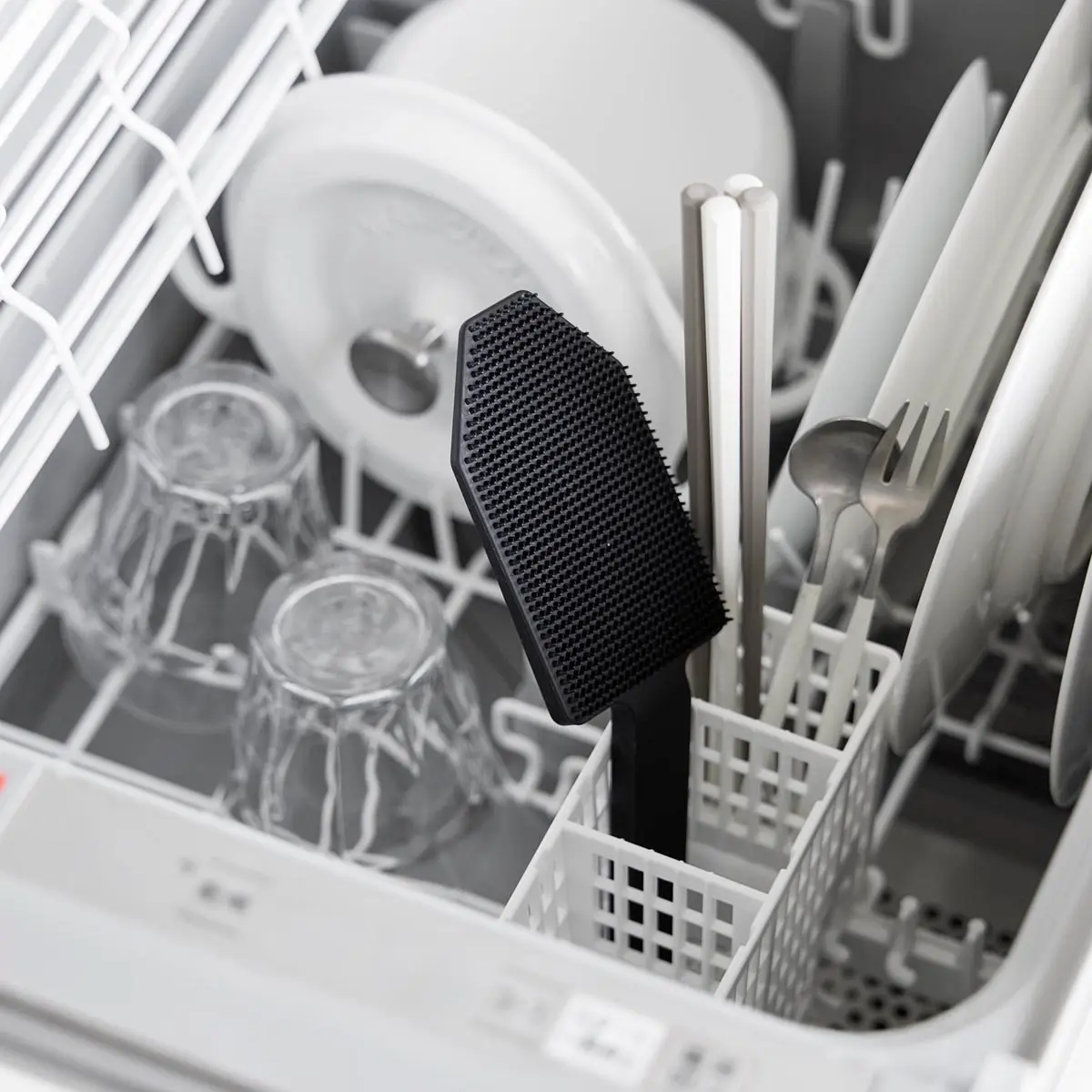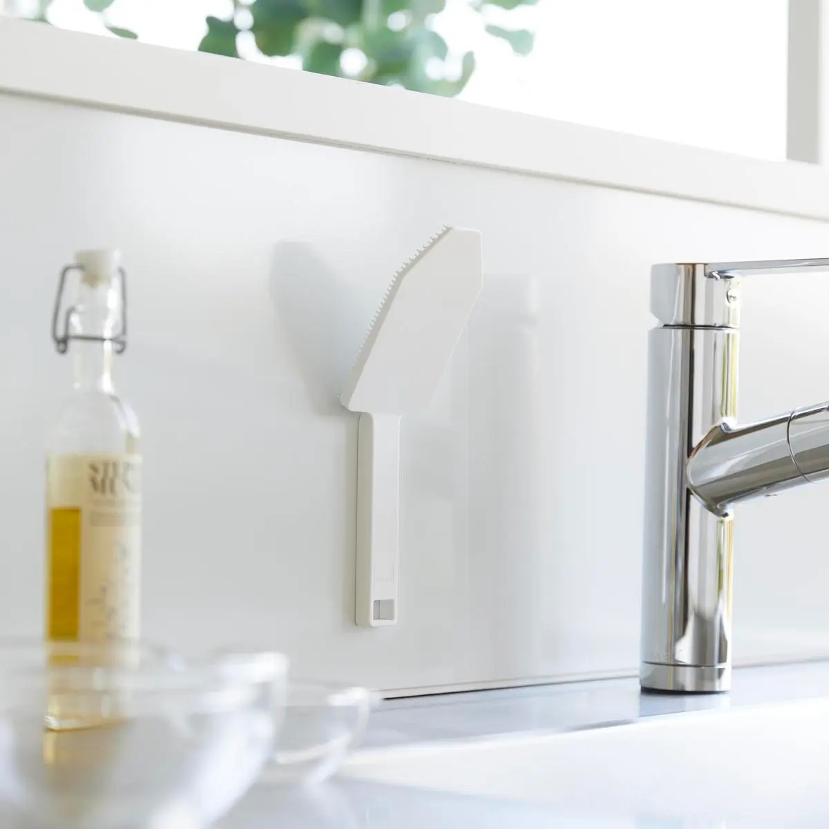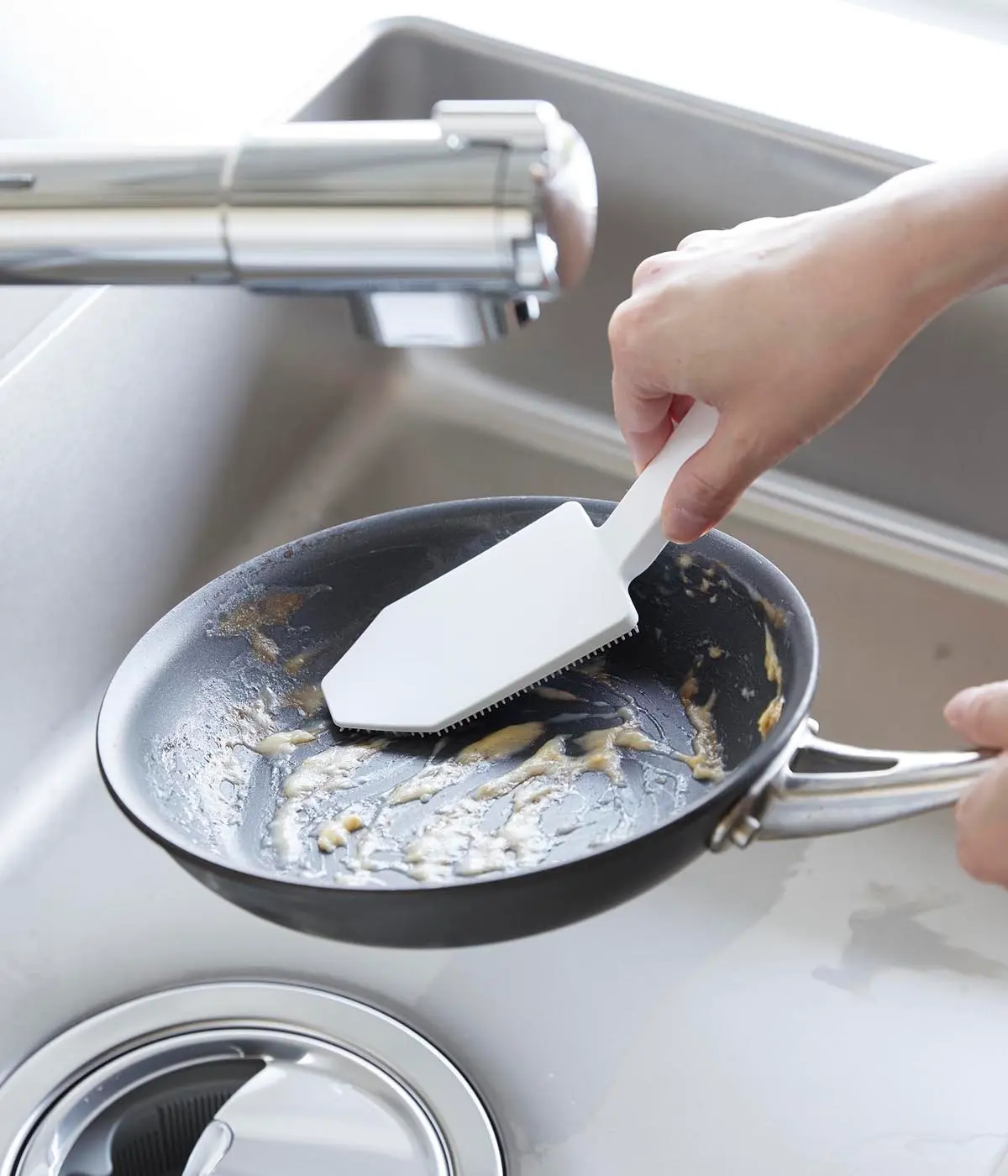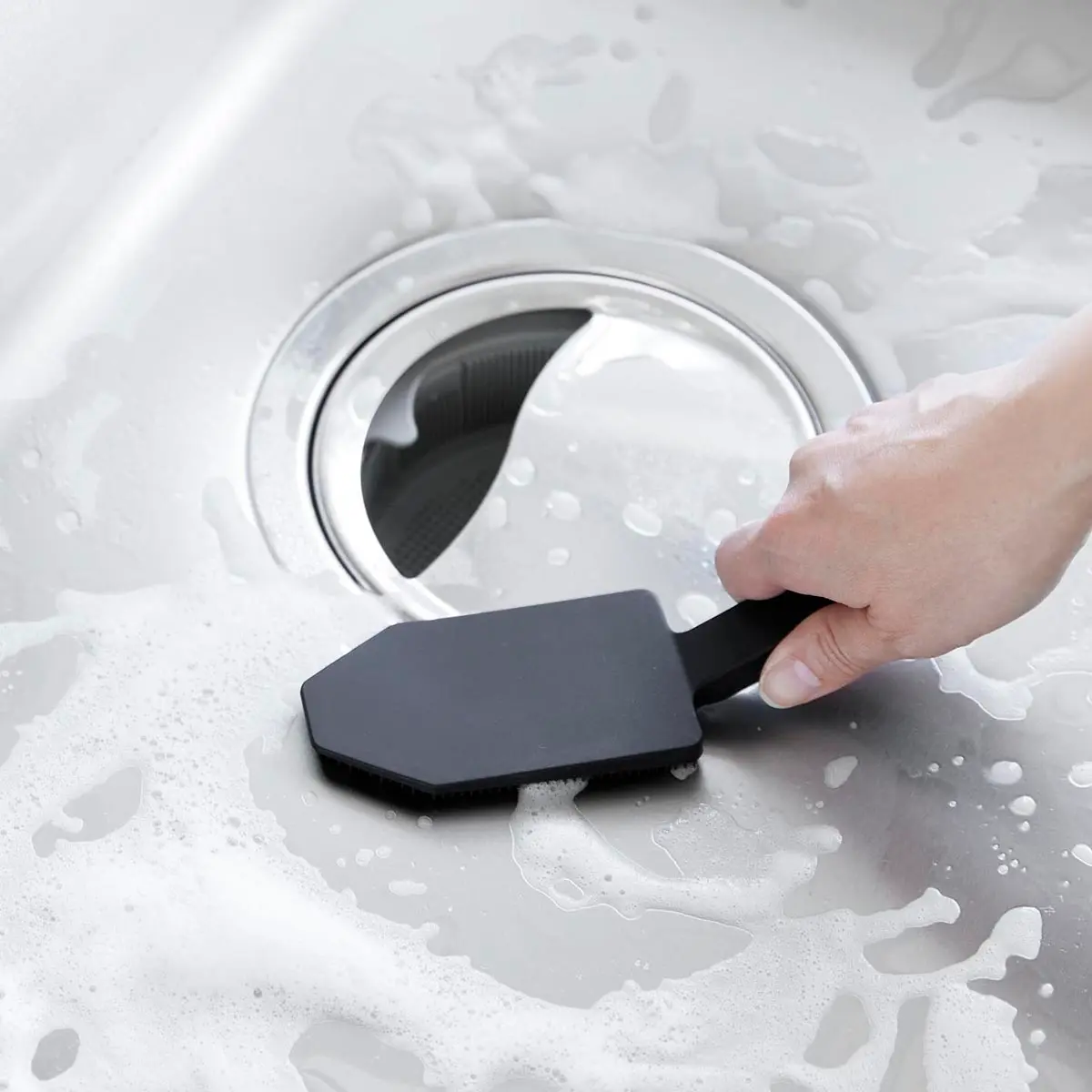 食洗機前の食器の汚れや、スポンジを汚したくないカレーやソースの付いた鍋やフライパンを洗うのに便利です。ハンドル付きなので指先をあまり濡らしたくないネイルをしている方にもおすすめです。細かいブラシがザルの目に入り込み、汚れをかき出します。シンクのお掃除にもぴったり。使用後は食洗機で洗えるので清潔に保てます。マグネットがつく壁面に収納することができます。