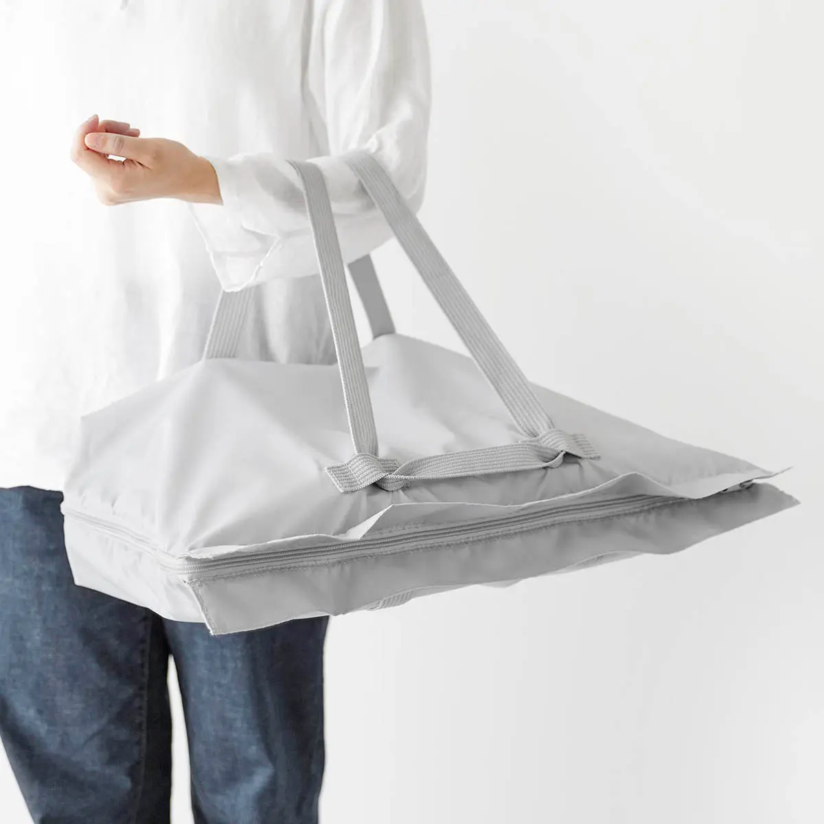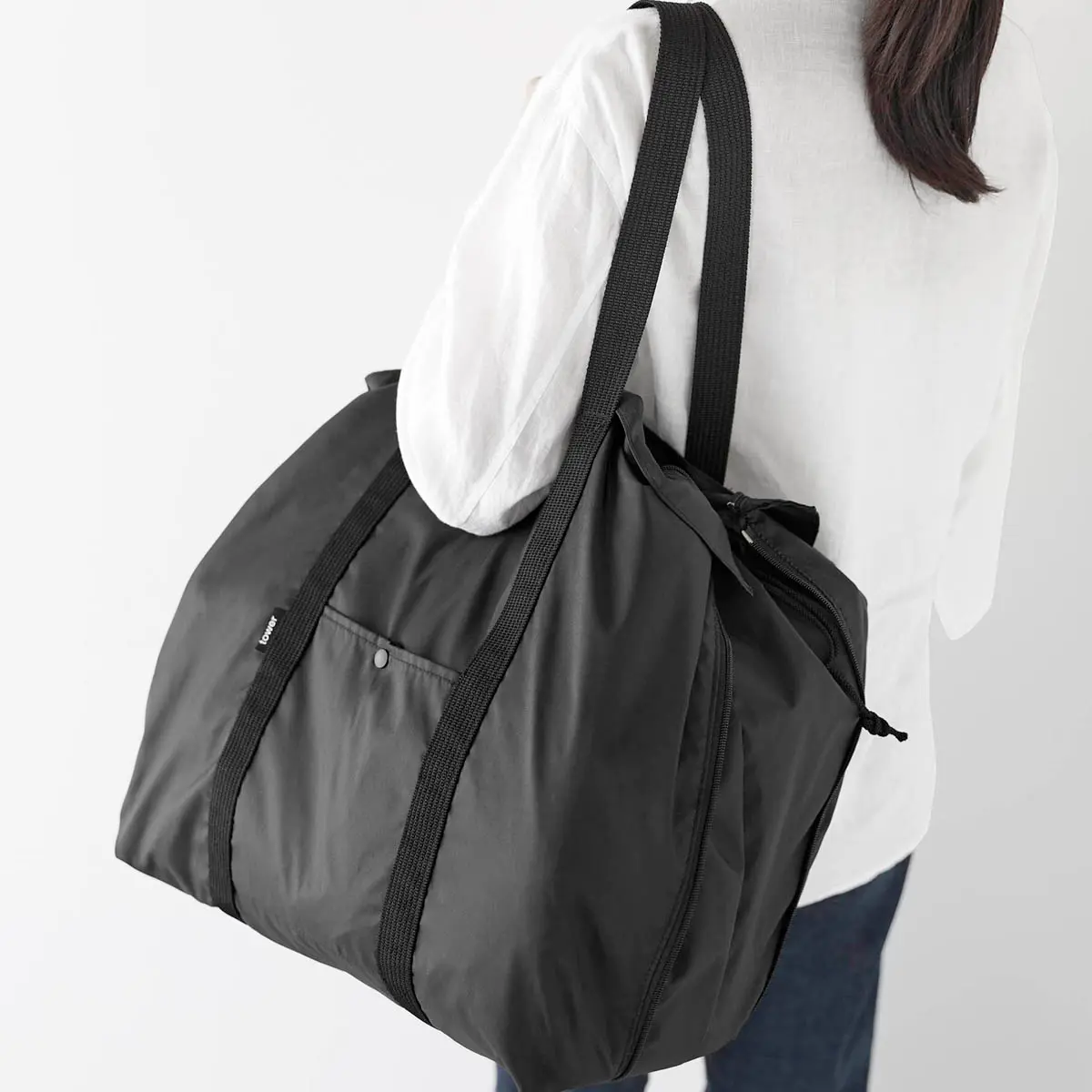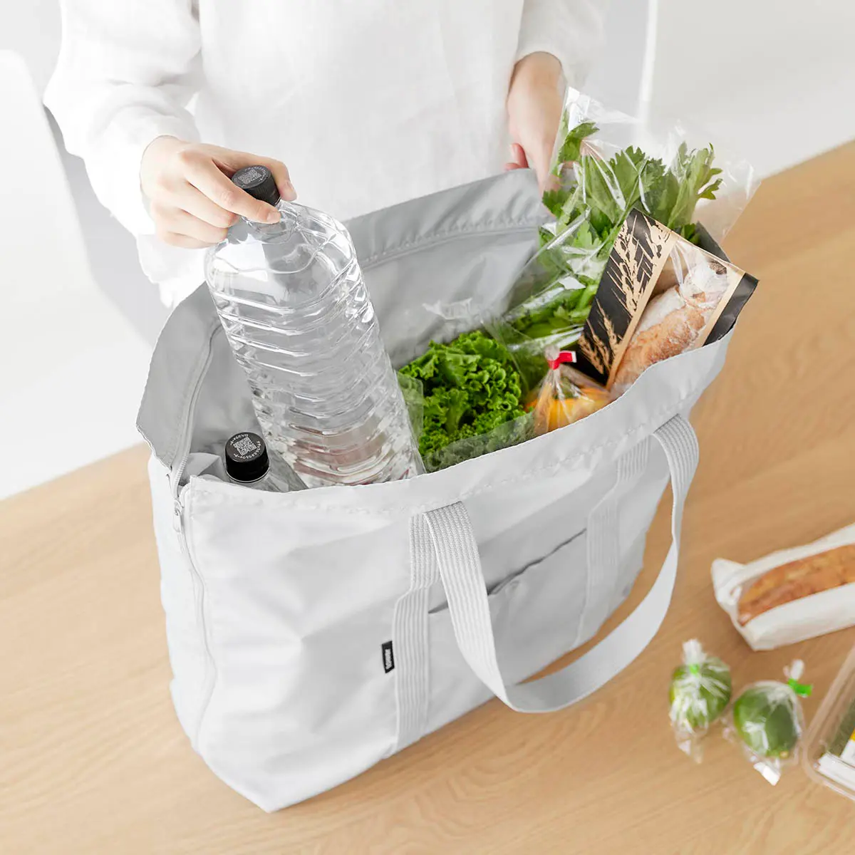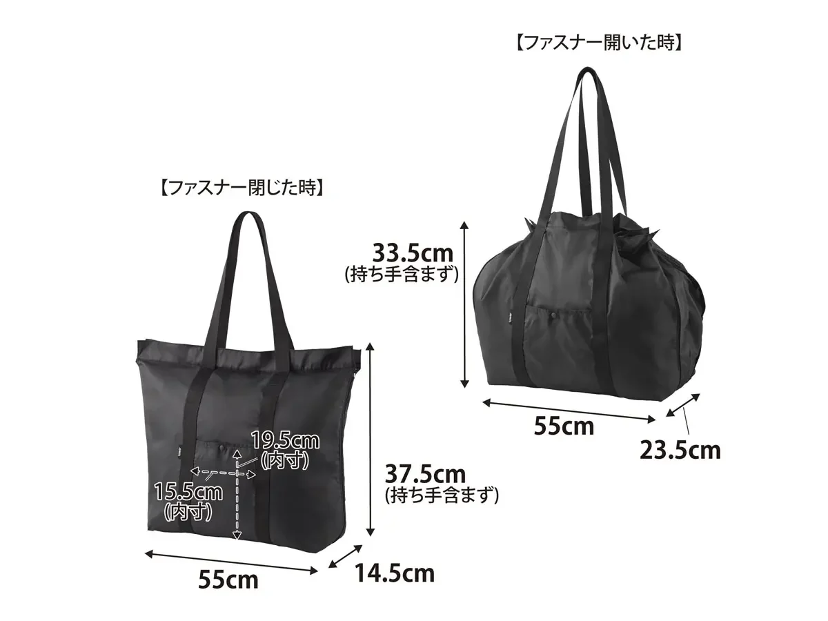 ファスナーを閉じれば少ない買い物の際のエコバッグとして、ファスナーを開けばレジかごかばんに、さらに、傾けたくない持ち帰り寿司やピザを水平持ちできる手提げに変化!