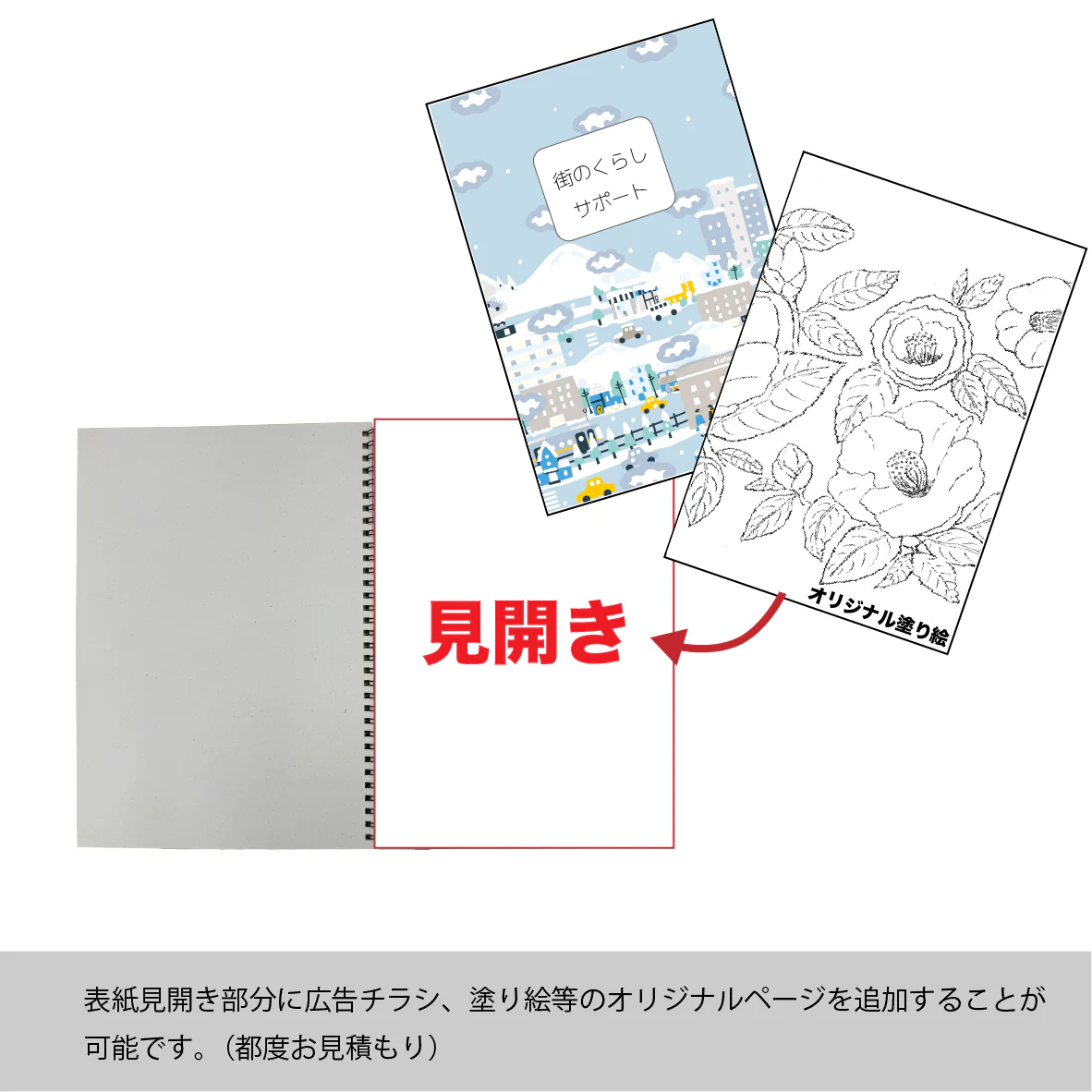 ・表紙の見開きには、「フルカラーフライヤー」「オリジナル塗り絵」を挿入することが可能です。